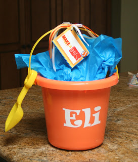 This is one of my favorite gifts to give kids whose birthdays are around summertime. I added their name in vinyl lettering on the outside of a beach bucket add a few beach, pool, water or bubble toys inside add a cute quick tag and your the hit of the party (well at least the moms think your clever).